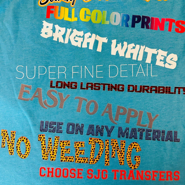 Look at the incredible detail you can achieve with any design without any connecting background or border on your design. Use DTF transfers in place of vinyl, screen printing, sublimation, and more.